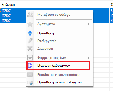 Αρχικά, επιλέγουμε τους χρήστες, τα στοιχεία των οποίων θέλουμε να εξάγουμε και με δεξί κλικ επιλέγουμε “Εξαγωγή δεδομένων”. (εικόνα 1).