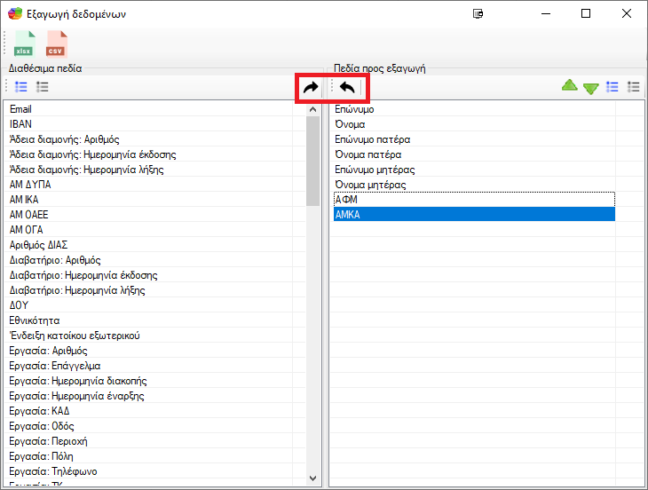 Στο παράθυρο που εμφανίζεται, επιλέγουμε τα πεδία που θέλουμε να εξάγουμε από την λίστα στα αριστερά. Μπορούμε να επιλέξουμε όλα τα πεδία επιλέγοντας το κουμπί “Επιλογή όλων” ή ορισμένα με κλικ στο στοιχείο και πατημένο το πλήκτρο Ctrl. Στη συνέχεια, πατάμε το πλήκτρο μεταφοράς ώστε να μεταφερθούν στα πεδία προς εξαγωγή (δεξιά λίστα). (εικόνα 2). Μπορούμε να αλλάξουμε τη σειρά των πεδίων με τα πράσινα βελάκια στο πάνω μέρος της λίστας.